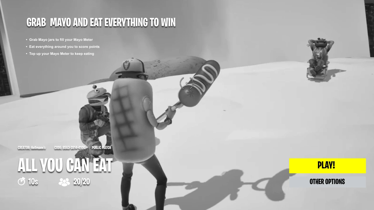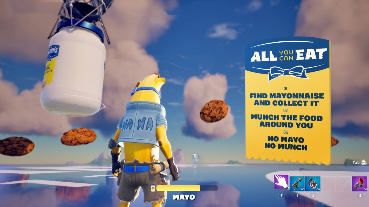 The goal was to develop a quick fun Island to promote a product, Mayonnaise, within the Fortnite ecosystem. The whole concept was challenging as it was requested to block the use of weapons and to include Mayo as an edible element, or even block players from eating without it - something impossible to do within the engine.